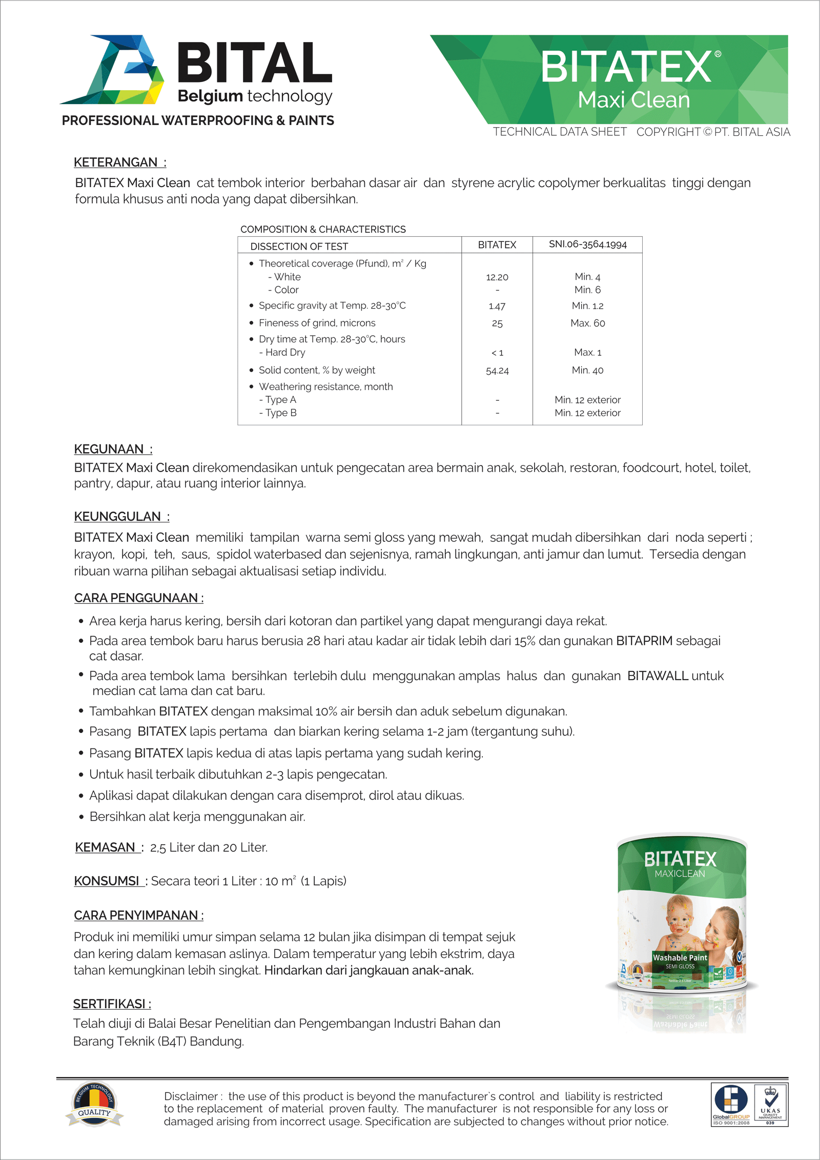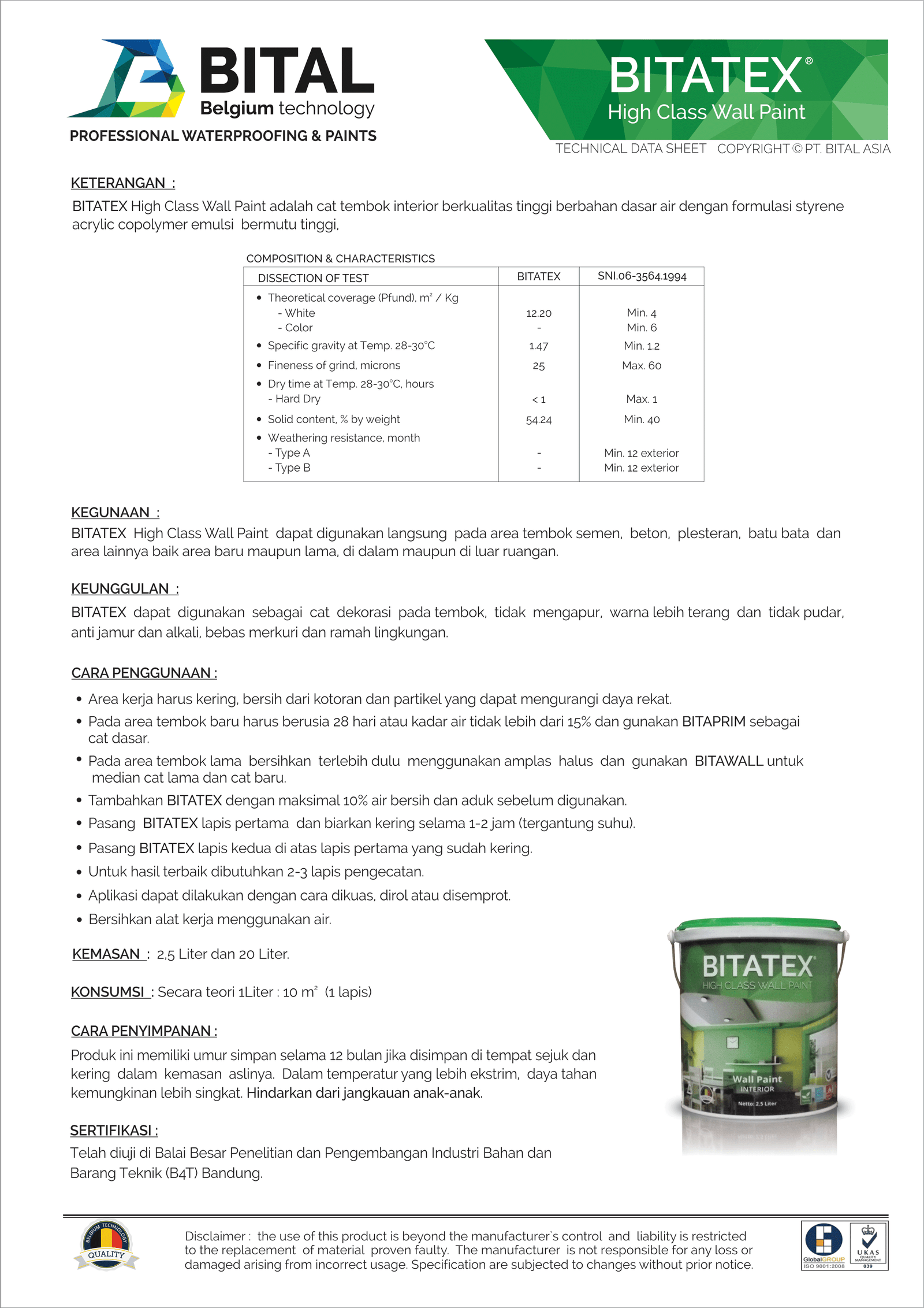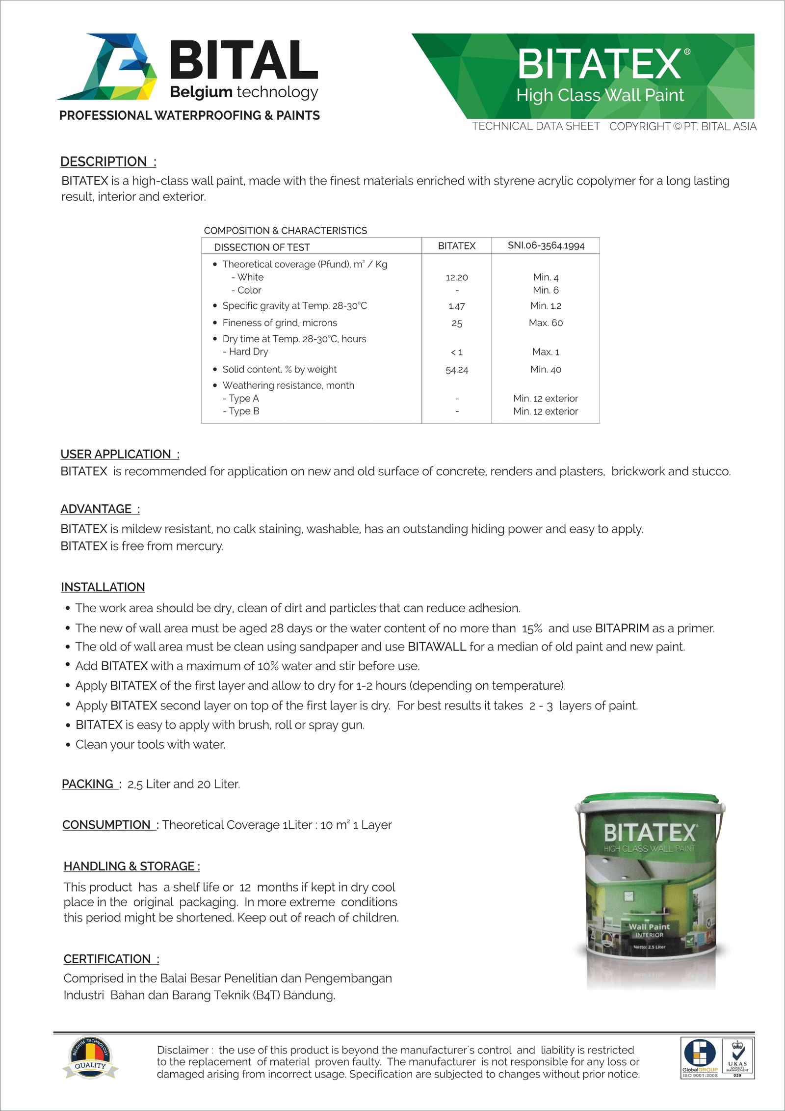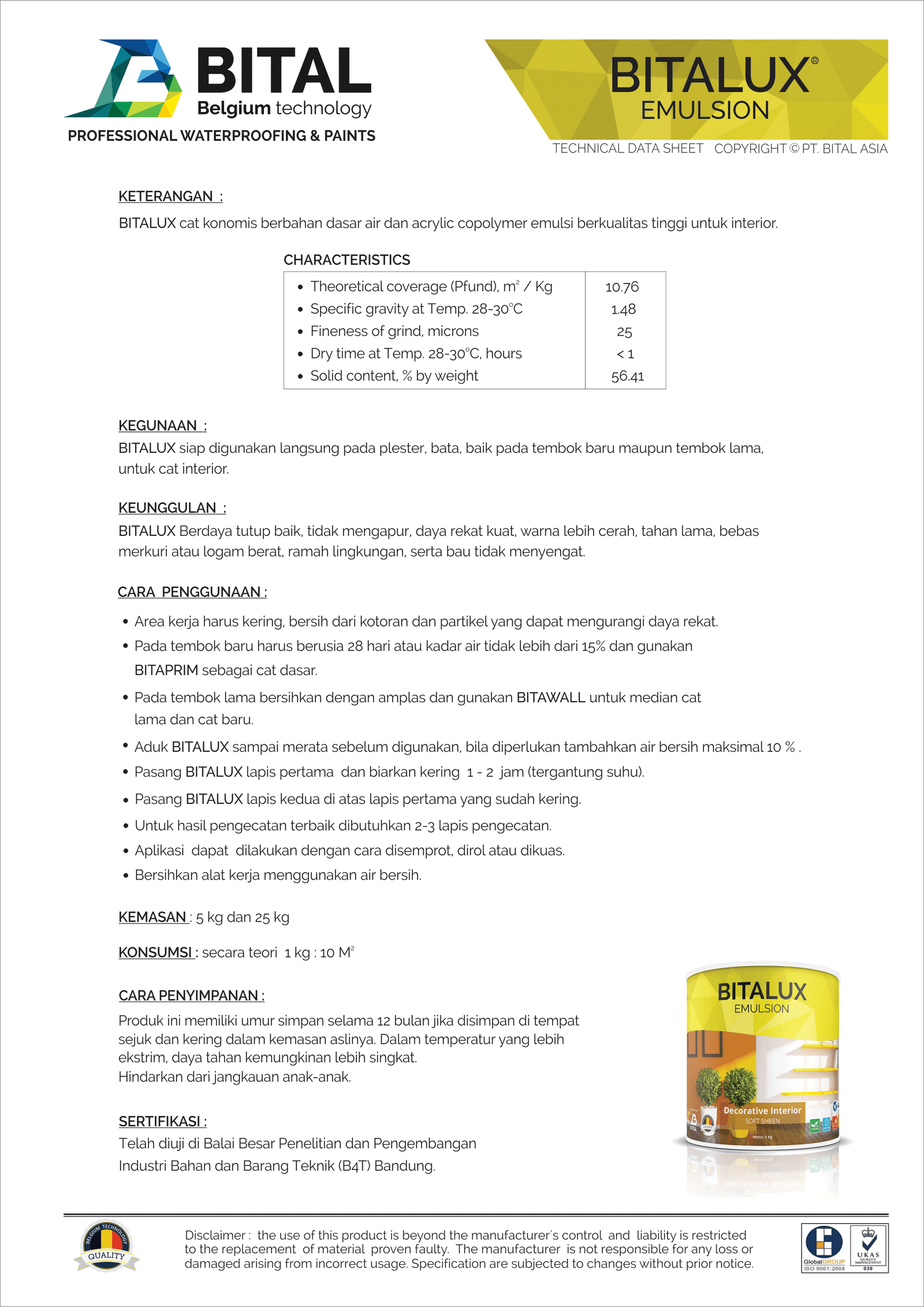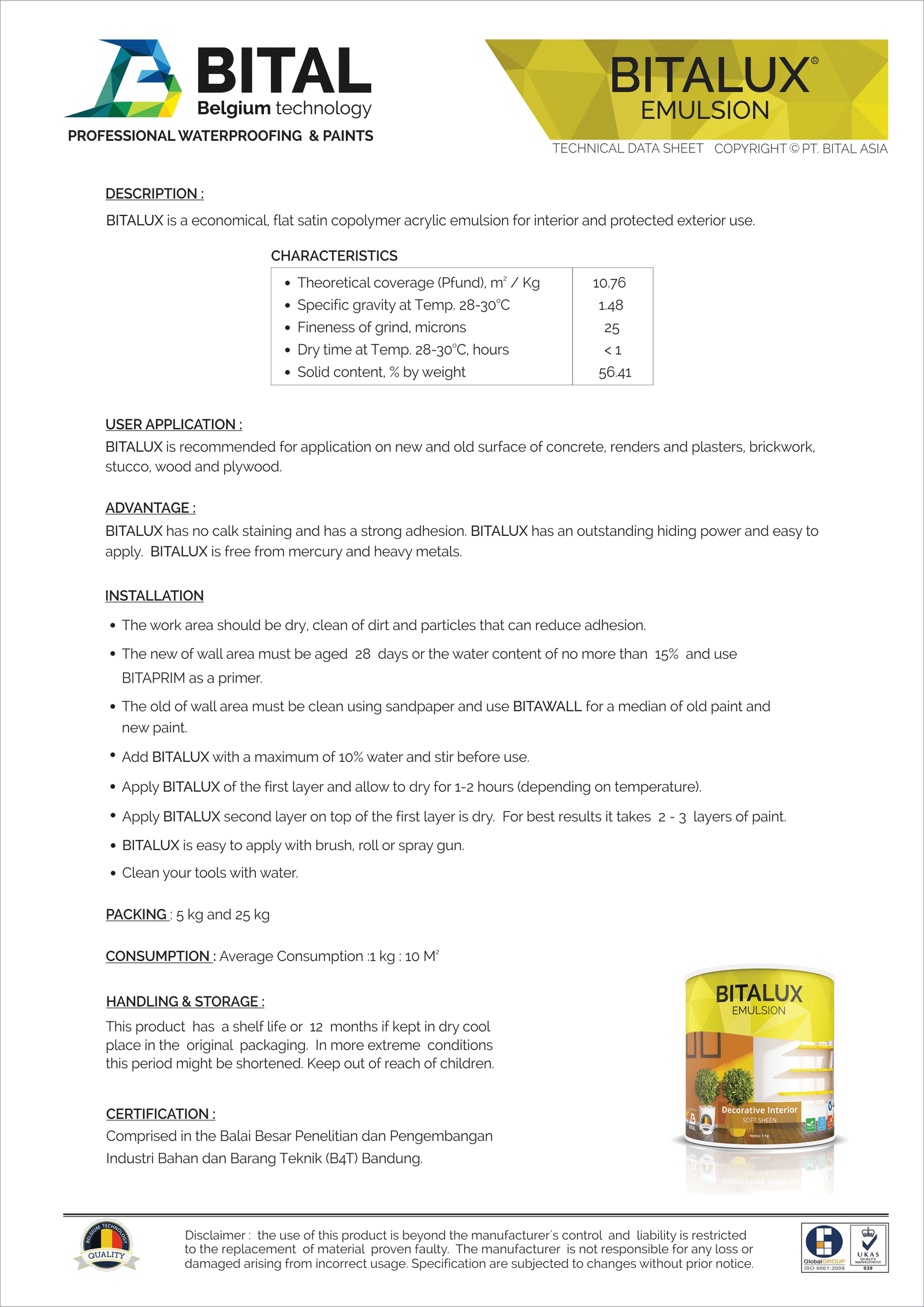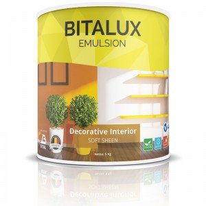 BITALUXacryliccopolymer emulsion paint for interior that easy to use. Good coverage, not calcify, strong adhesion, mercury free or heavy metal and environment friendly