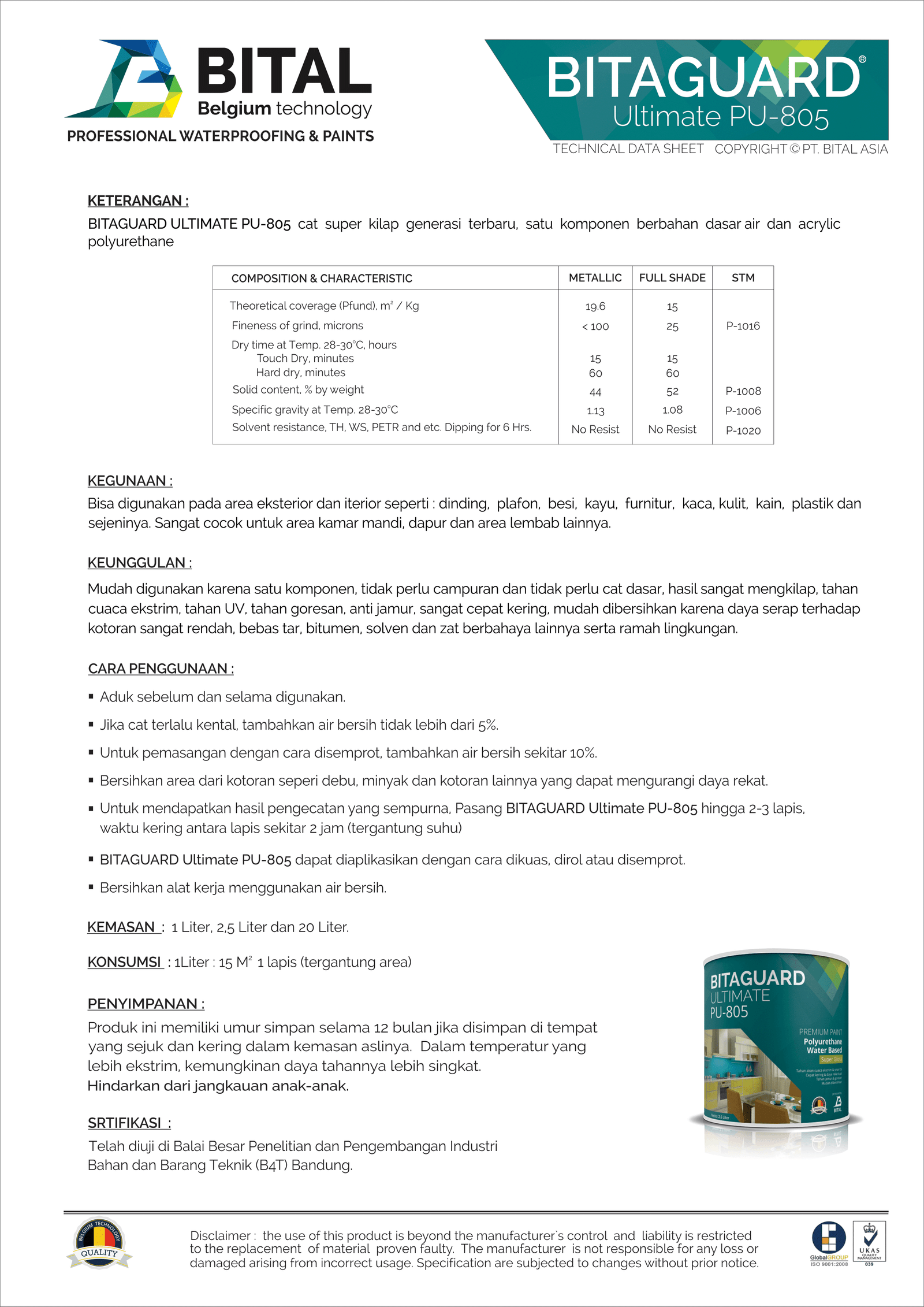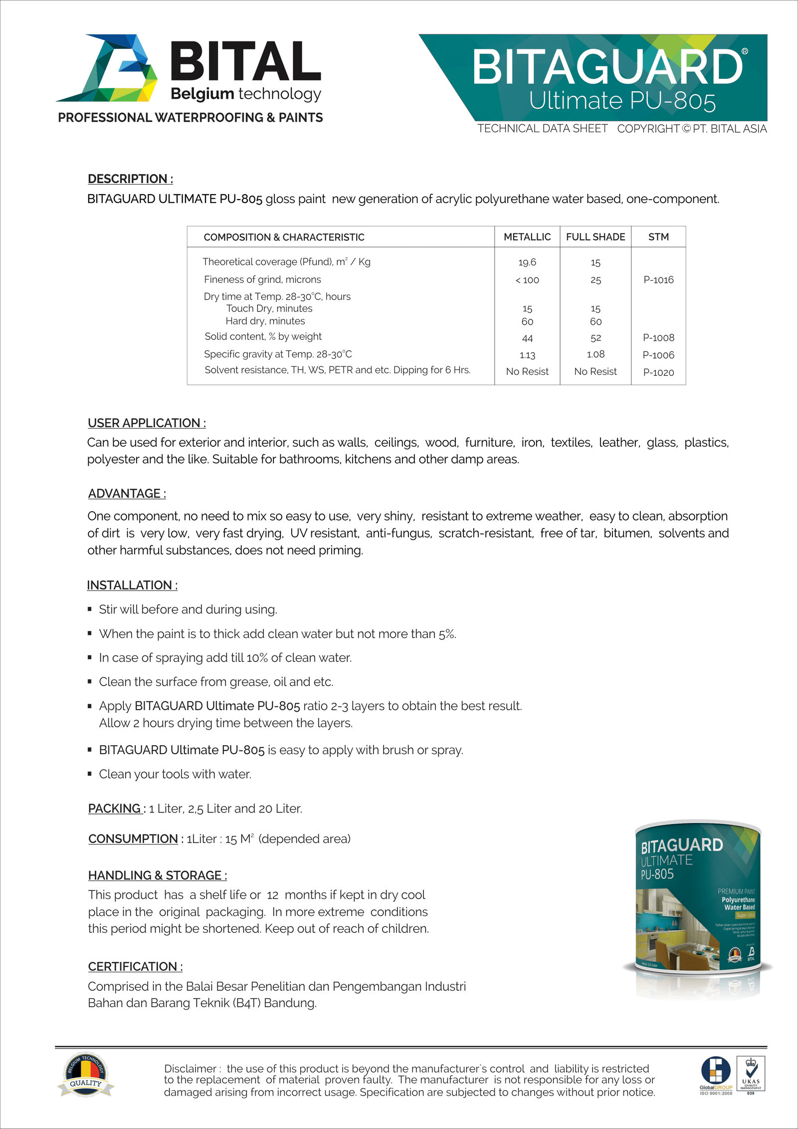 BITAGUARD ULTIMATE PU-805 glossy premium interior paint. New generation of water based one component polyurethane which dry quickly, odorless and easy to clean