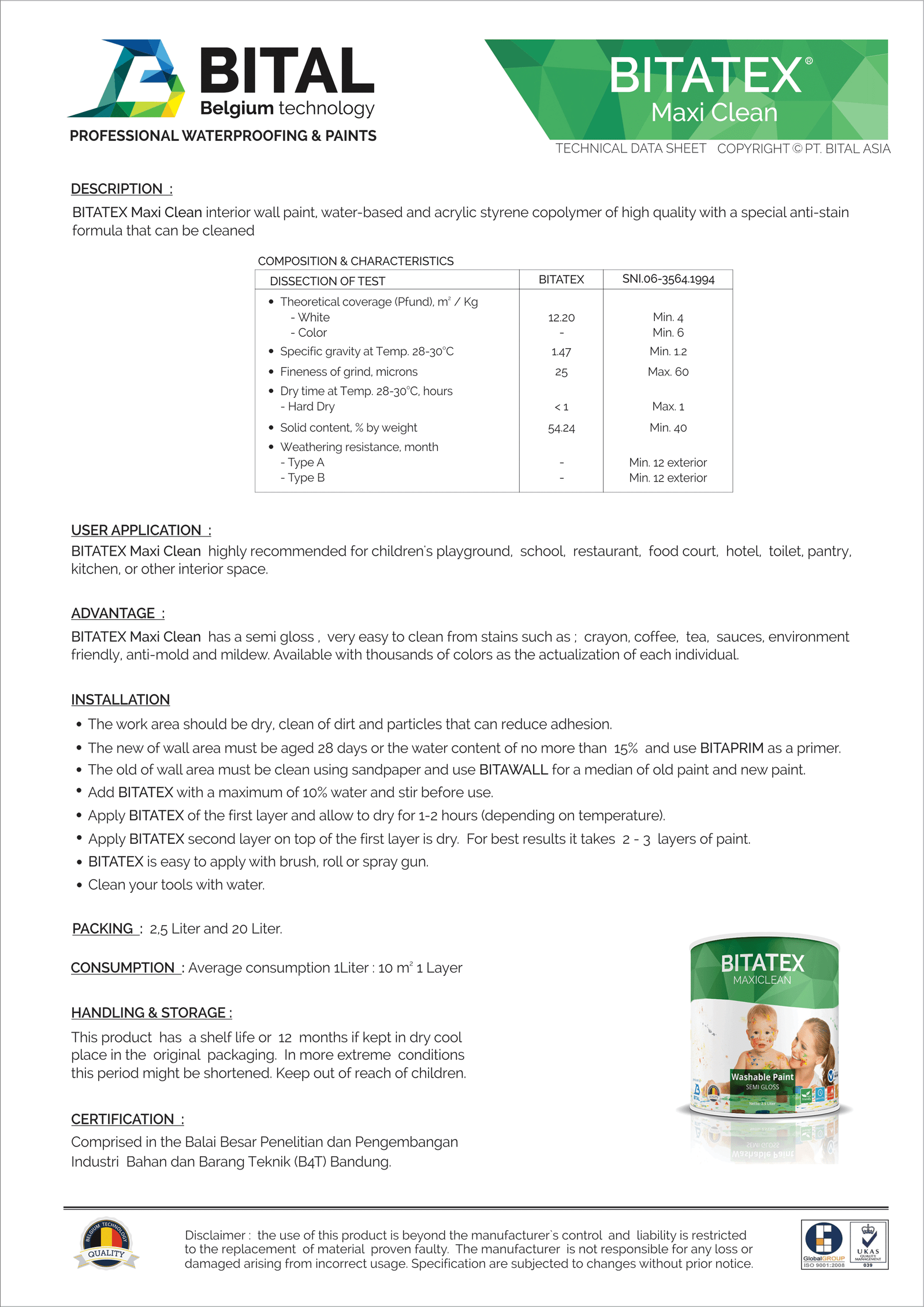 BITATEX MAXICLEAN is a high quality wall paint for interior with water base special formula for anti stain with semi gloss appearance. Really suitable for playgrounds, schools, restaurants, etc.